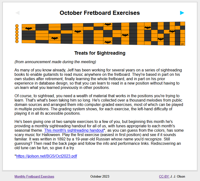 Each month has an "announcement" page (from the newsletter) that explains the theme for that month and tries to tantalize your curiosity with hints and interesting tidbits, but without revealing the music's identity. Links are provided to the actual one-sheet PDF handout for that month, while the arrowhead in the upper right will take you to the next month.